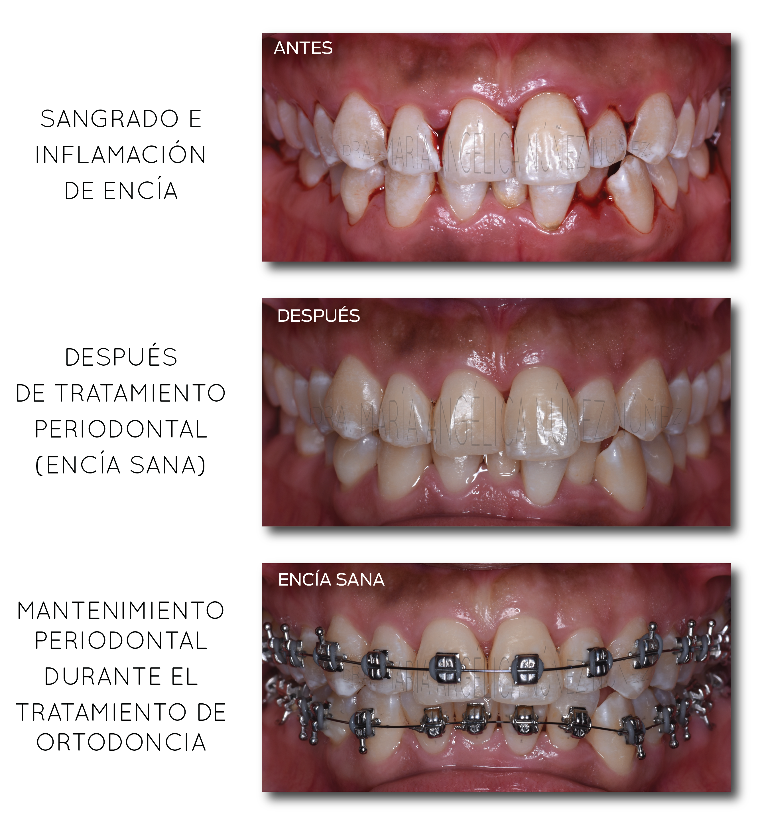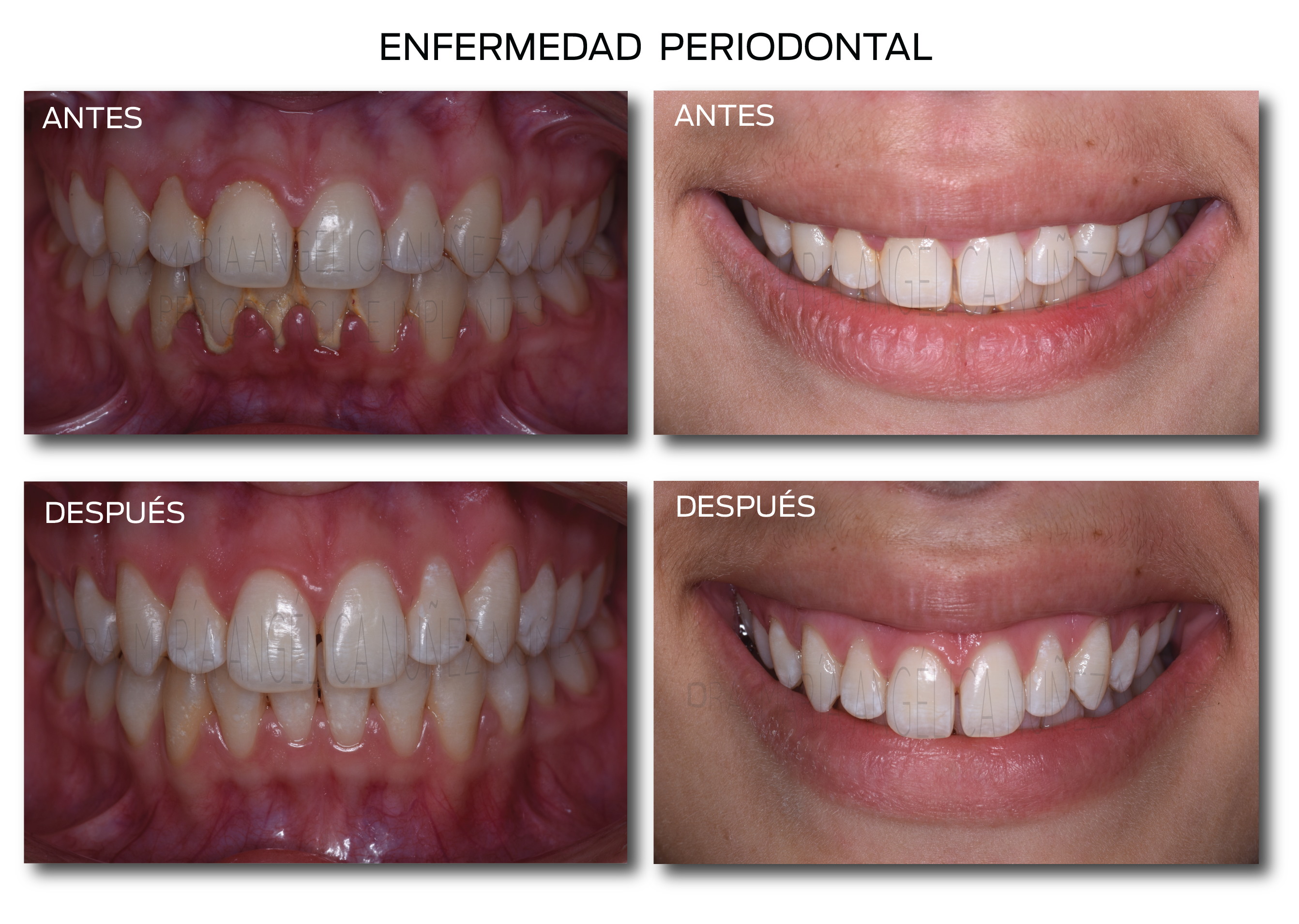 Observe que la encía desinflamó totalmente después del tratamiento. En este caso los espacios entre las piezas entre las piezas son secuelas que provocó la infección al perderse hueso, una vez que el paciente esté sano de sus encías (no antes) puede corregirse los espacios con tratamiento de ortodoncia.
